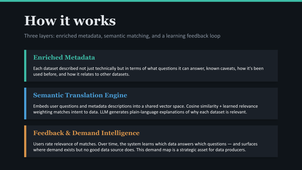 The idea is simple in concept: build a semantic translation layer that sits between user intent and data metadata. Instead of requiring users to learn the language of the data, the system learns the language of users' needs.