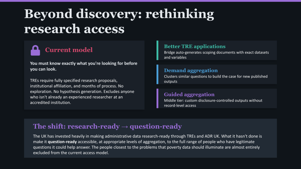 The shift matters because the people closest to the problems that poverty data should illuminate, frontline charities, community organisations, local authority officers, the people being described by the data are almost entirely excluded from the current access model. They have questions. The data has answers. The bridge isn't just about connecting the two but about building an infrastructure that treats their questions as legitimate grounds for access, not just the questions that arrive wrapped in a formal research proposal from a Russell Group university.