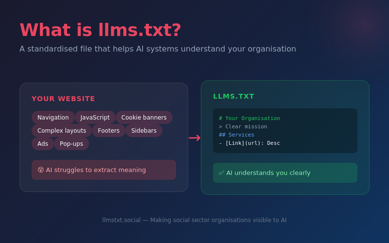 AI systems - the large language models (LLMs) that power everything from ChatGPT to Claude to various coding assistants - increasingly need to understand websites. Whether it's answering questions about an organisation, helping someone find support services, or assisting a funder in understanding who's working in a particular space, these systems need to get information from somewhere.
