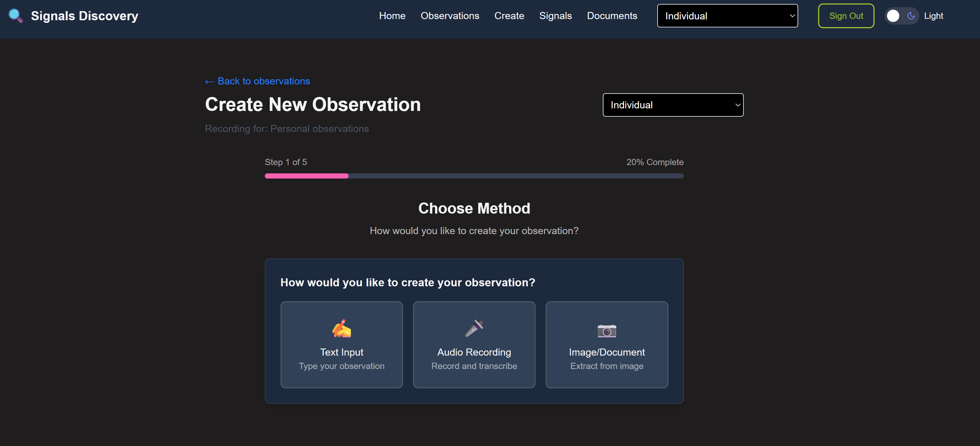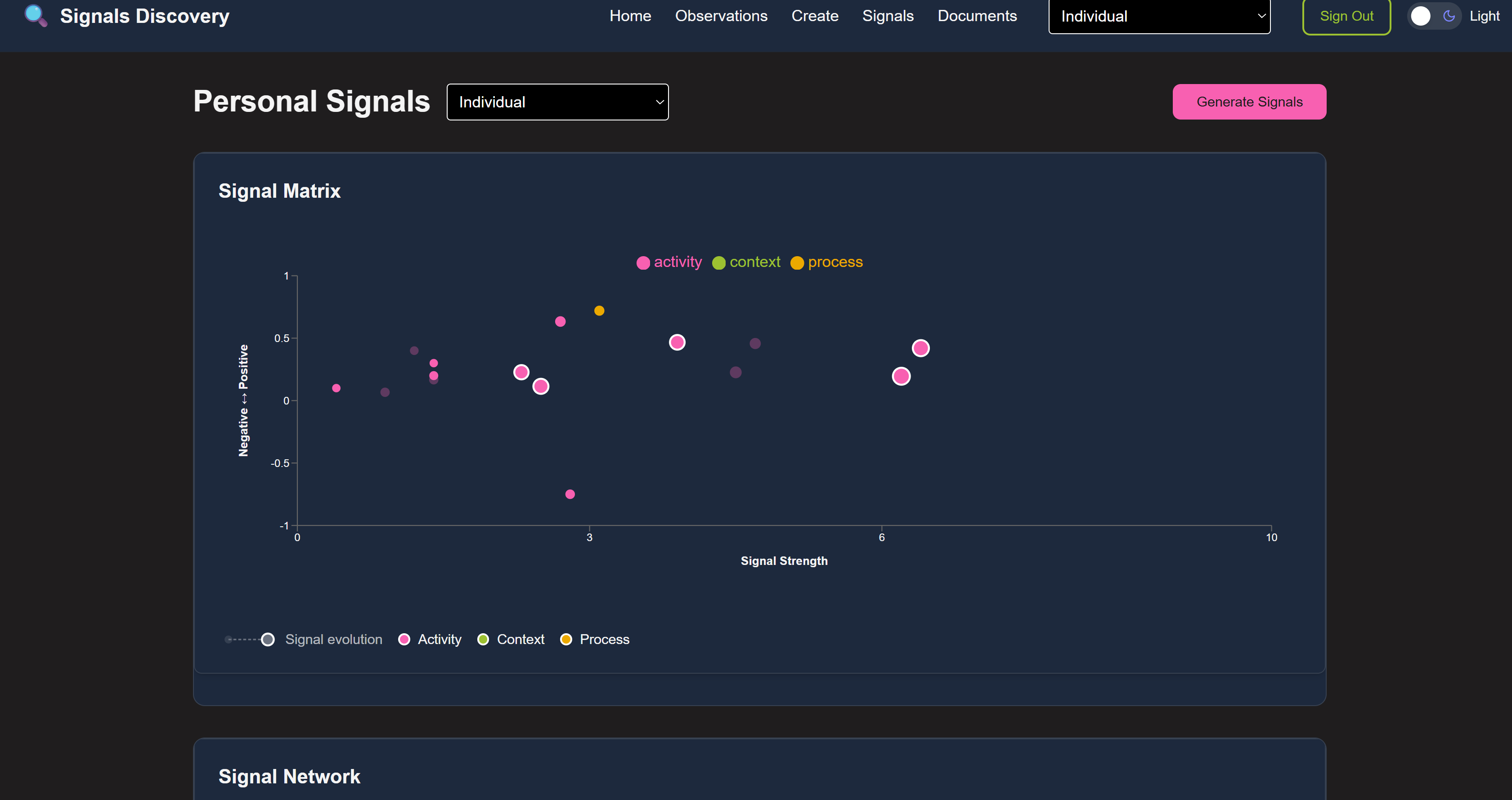 A dashboard that focuses on surfacing signals, patterns, narratives, tensions all without forcing them into fixed metrics. A shared space where people can add reflections, data points, stories, observations from their work.