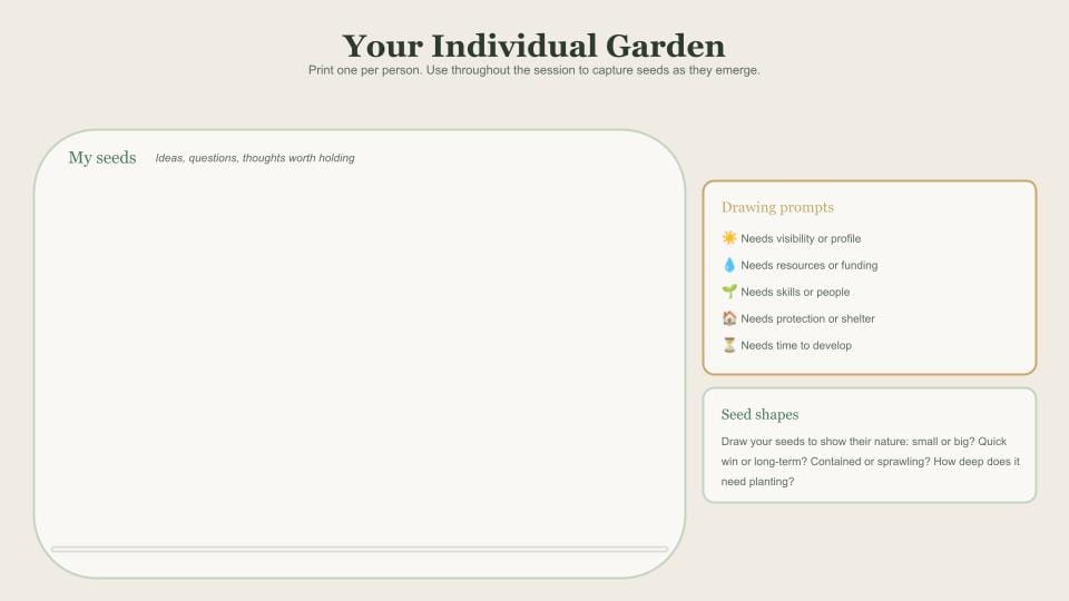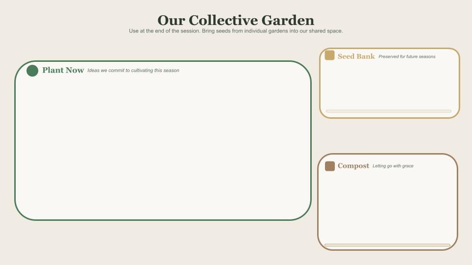 For groups, the framework adds a layer. Each person maintains their own garden throughout a session, capturing seeds as they emerge. A shared seed bank catches ideas that surface when the group can't explore them, and intentionally, you schedule when to return to it. At the close, people bring seeds from individual gardens into a collective space, deciding together what to plant, bank, or compost.