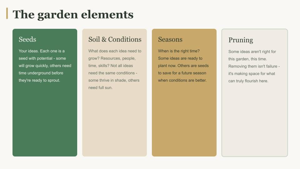 Framing our ideas as seeds, our soil as conditions, our pruning or composting as choices seems to land with people. And in a world where our to-do list never shrinks, this approach can feel both kinder and more decisive.